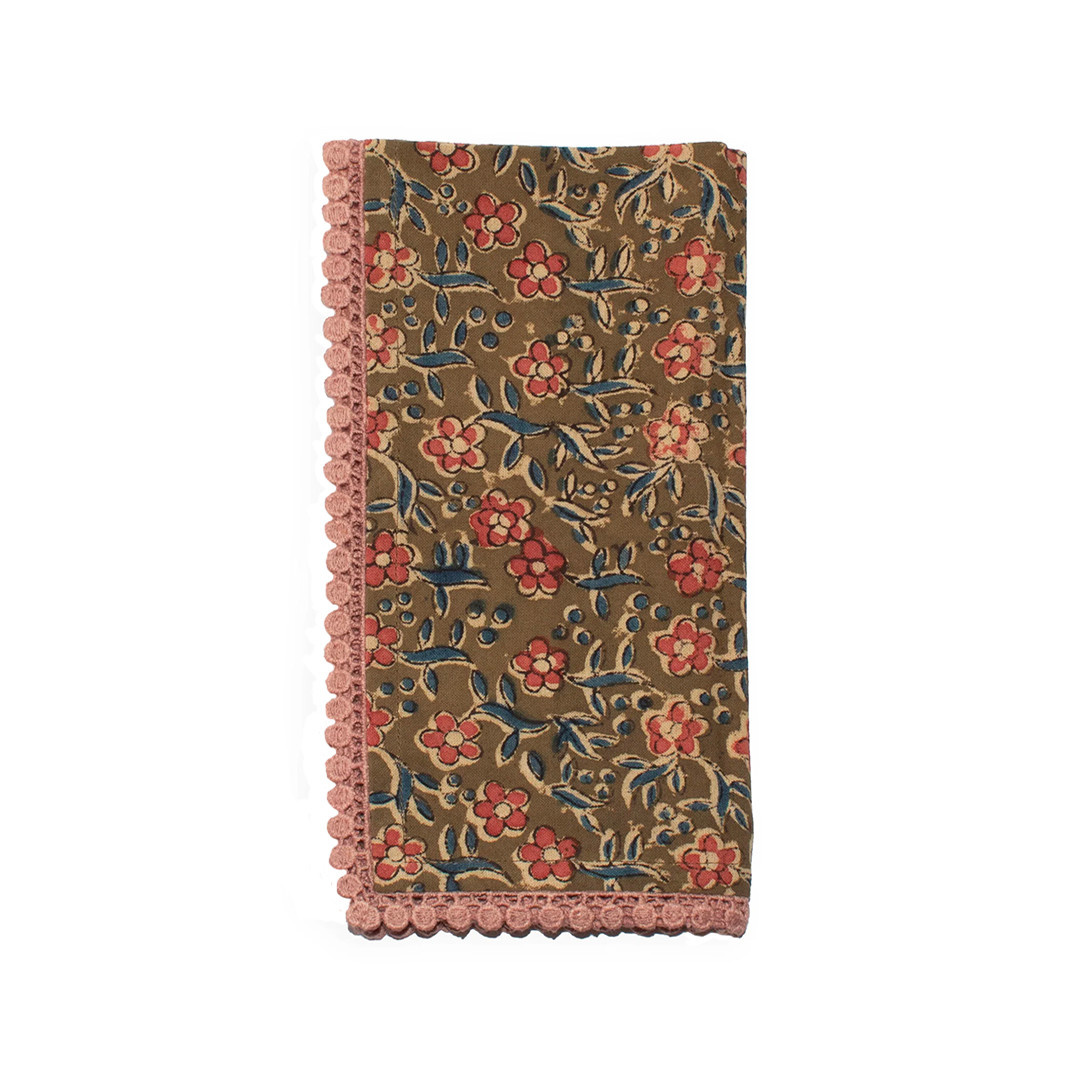 The Anika Napkin in Pesta features a vintage-inspired floral print accented with a blush crochet trim. Crafted from linen, it blends charm and practicality—perfect for brightening everyday meals or adding a romantic touch to gatherings.