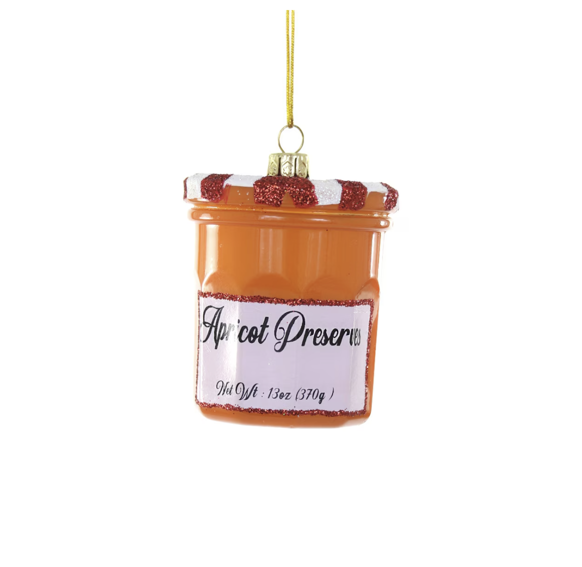 The Apricot Preserve Ornament adds a charming and nostalgic touch to your holiday decor with its lifelike jar design, perfect for food-themed displays.
