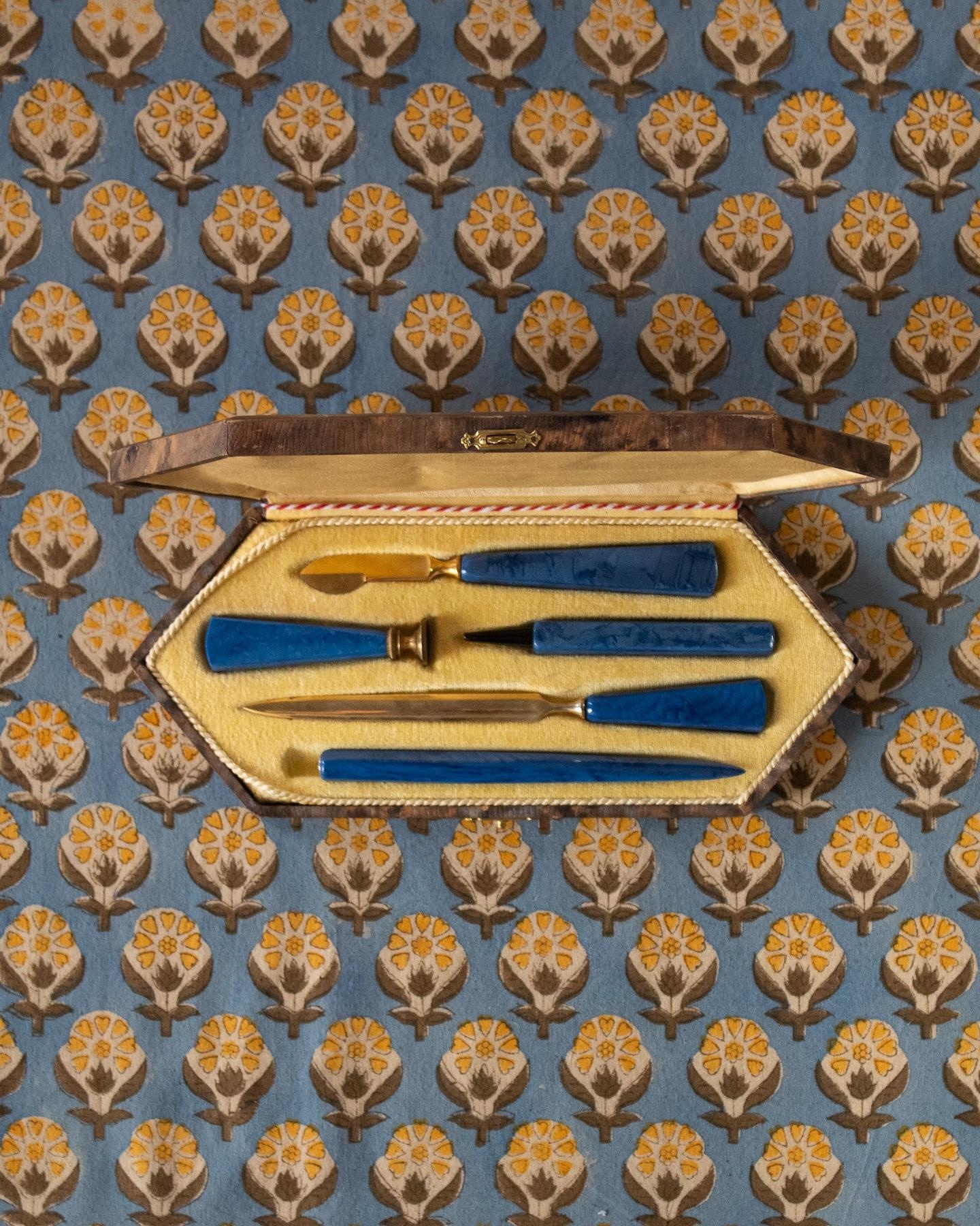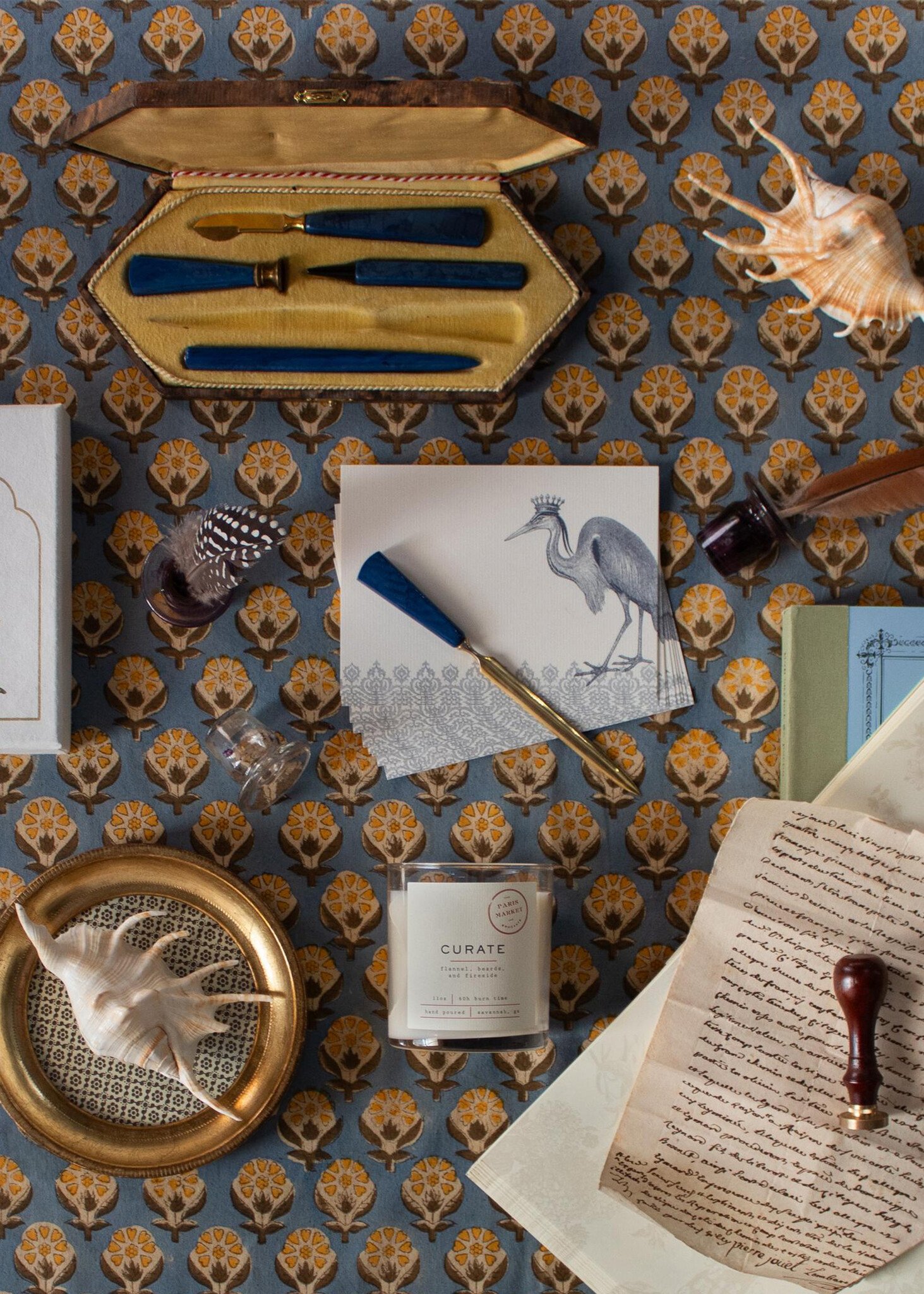 There’s a particular kind of stillness found in a well-loved desk—the kind lined with objects chosen with care. A seal resting on parchment. A fountain pen beside a feathered quill. A matchbox kept not for function, but for memory.