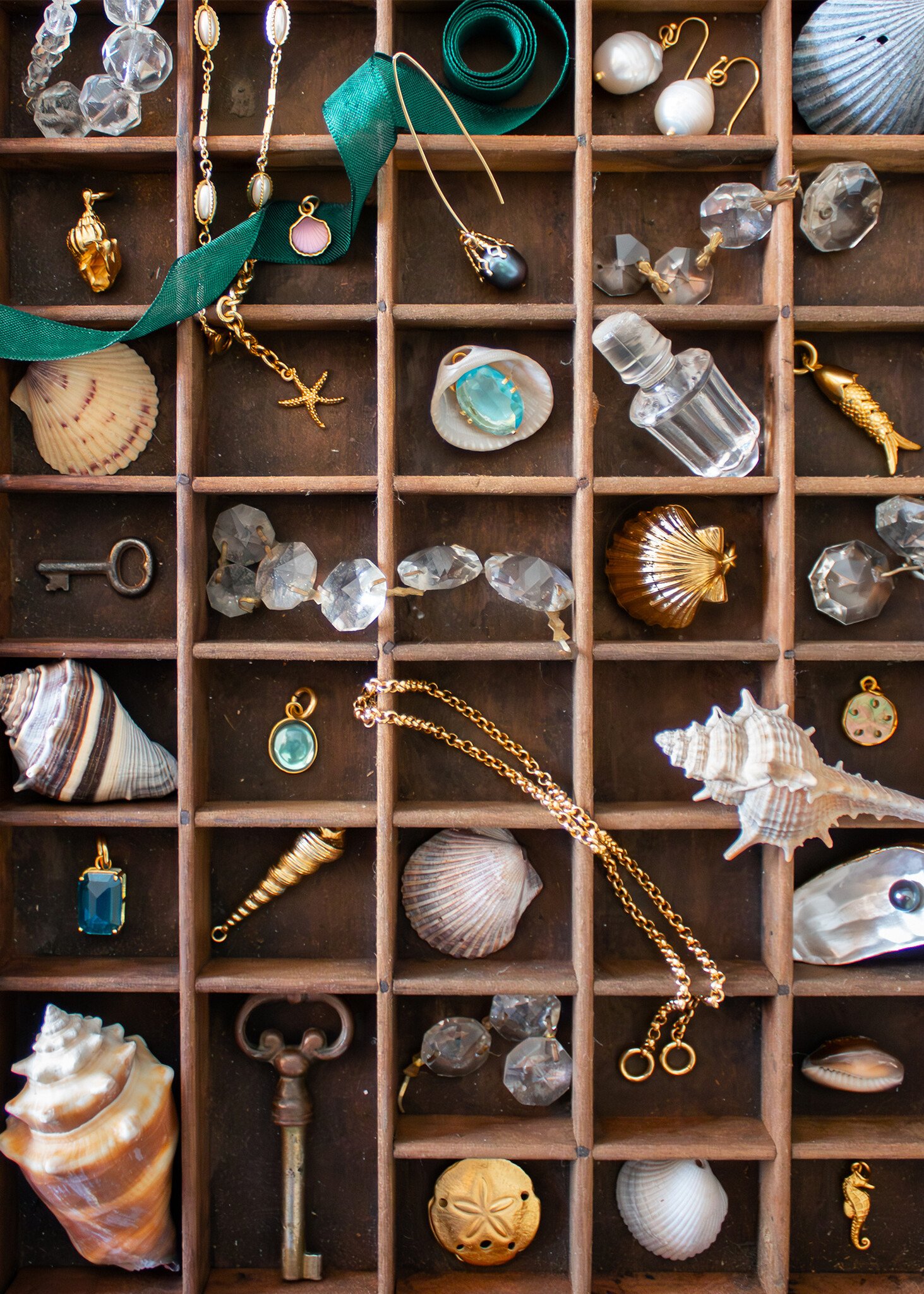 Arranged in the drawers of an old wooden printer’s tray, these pieces feel like pages from a shell-strewn diary. A kind of wearable tide pool, glimmering with quiet magic.