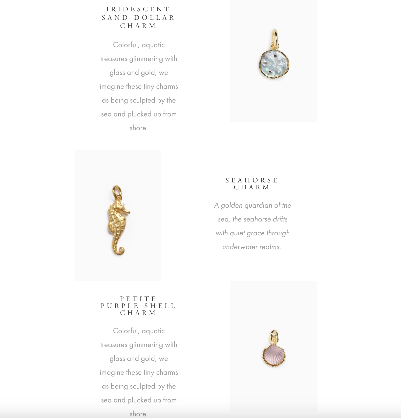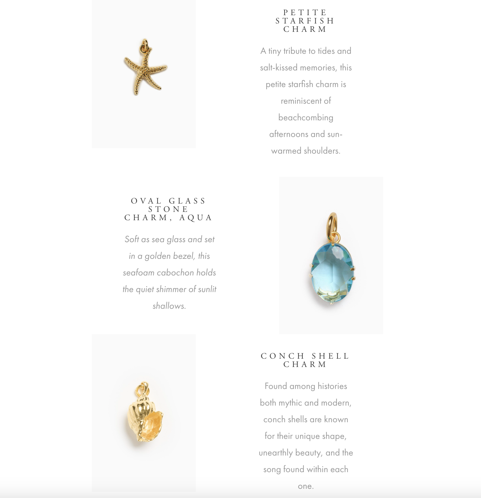 This little collection is a love letter to that part of summer, the hidden part. Golden shells, sea-glass charms, baroque pearls, a petite seahorse. The kinds of pieces you might find tucked into the palm of a child, or inside a jewelry box long forgotten.