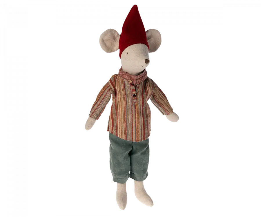 A classic mouse in size medium dressed in cozy Christmas clothes. Use them for play or as a part of your home decoration during December. His hat is removeable so when the season is over you can change her clothes and she is ready for more play.