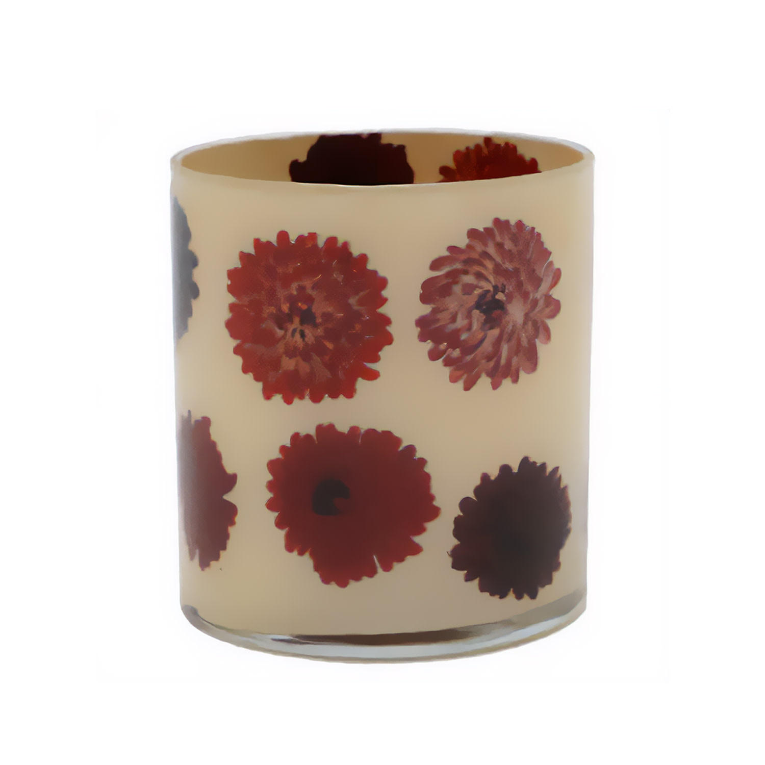 A tall, cylindrical desk cup, this objet d'art features a collection of pink and purple flowers on a neutral background from a 19th century wallpaper découpaged beneath handblown glass by John Derian in his New York studio.