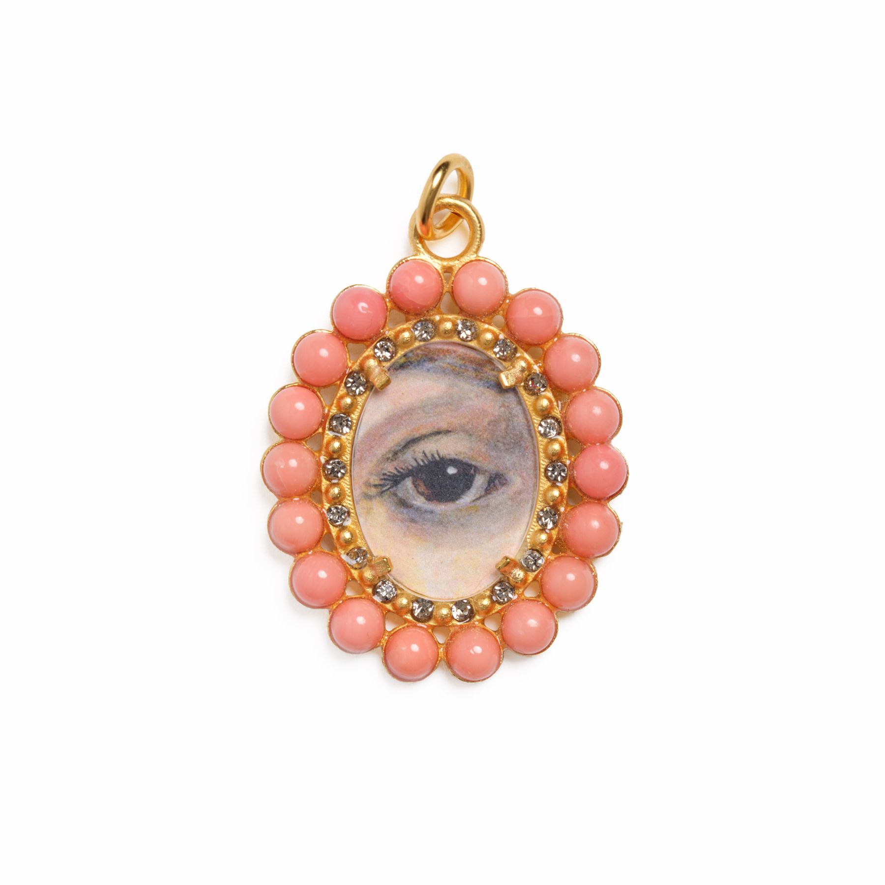 A charming recreation of traditional Lover’s Eye jewelry, inspired by the secret 1785 romance between a widowed commoner and the Prince of Wales. Framed in coral beads and painted by a local Savannah artist. Custom orders available upon request.