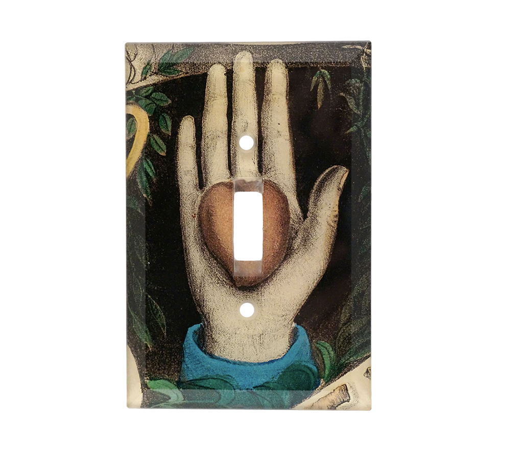 A tender emblem of devotion: layered antique print beneath hand-blown glass, this “Heart in Hand” switch plate cover brings quiet art to the everyday. Each piece is handmade in New York City, adding vintage charm and subtle luxury to your wall.