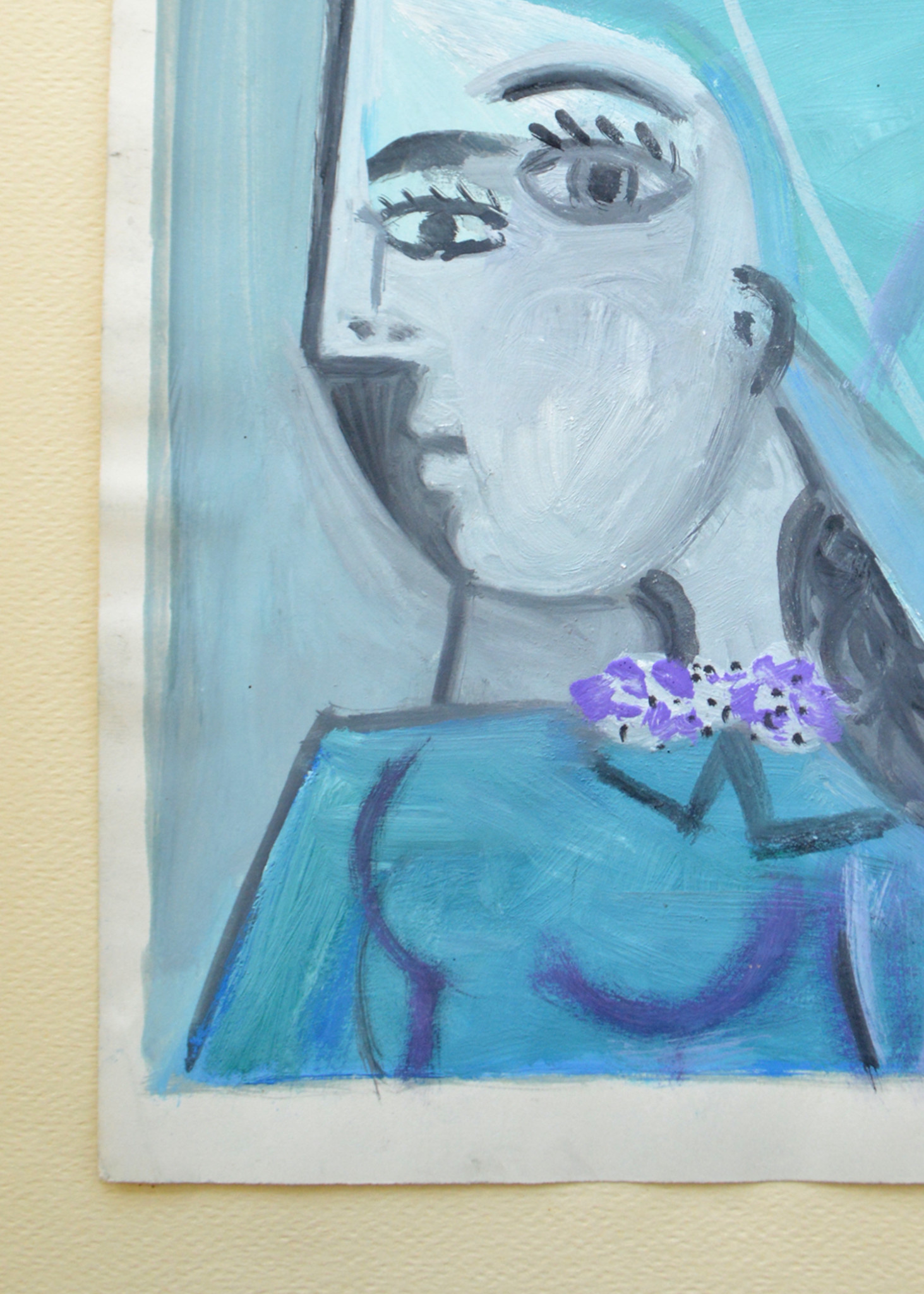 Curious and serene, this portrait of a woman is captured in dozens of shades of blue, broken only by the delicate purple and white scarf tied neatly about her throat. Painted May 11, 1984 in a style attributed to cubism.