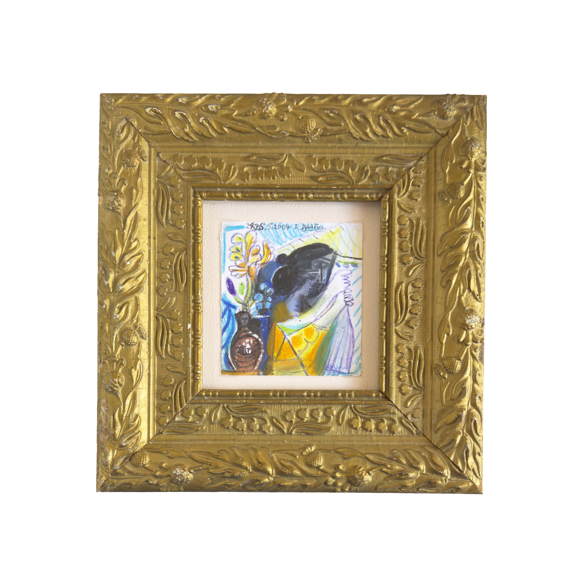 A woman and young girl stride past a vase filled with Bird of Paradise. Leaning into the joyful tone, the dominant color of this piece is a blend of yellow and orange, cut by splashes of green pastels and pencil. Created May 25, 2004.