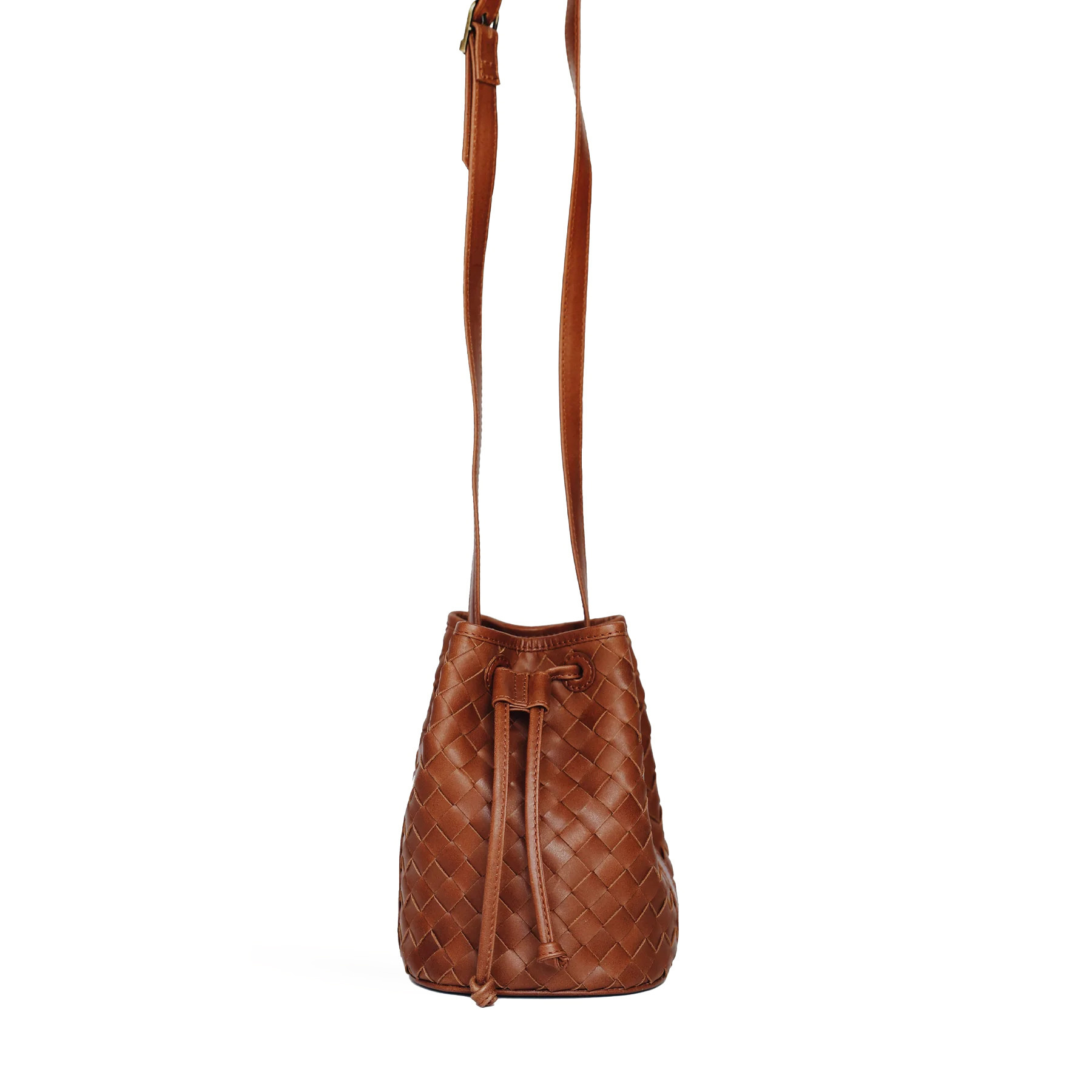 This vintage-inspired bucket bag in handwoven carré leather, features a long, adjustable shoulder strap and drawstring closure.