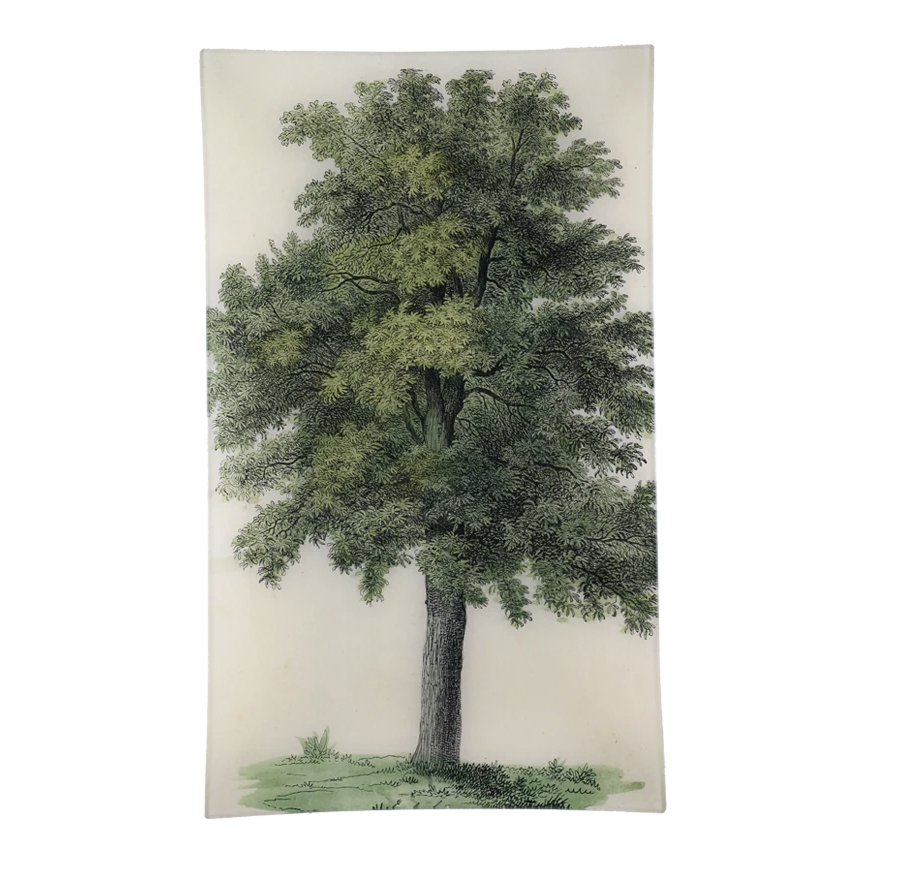 A stately oak rendered in 19th-century print and layered beneath hand-blown glass. Handmade in New York City, this 12″ × 20″ tray includes a wall hanger—bringing nature’s quiet grandeur to table or gallery wall alike.