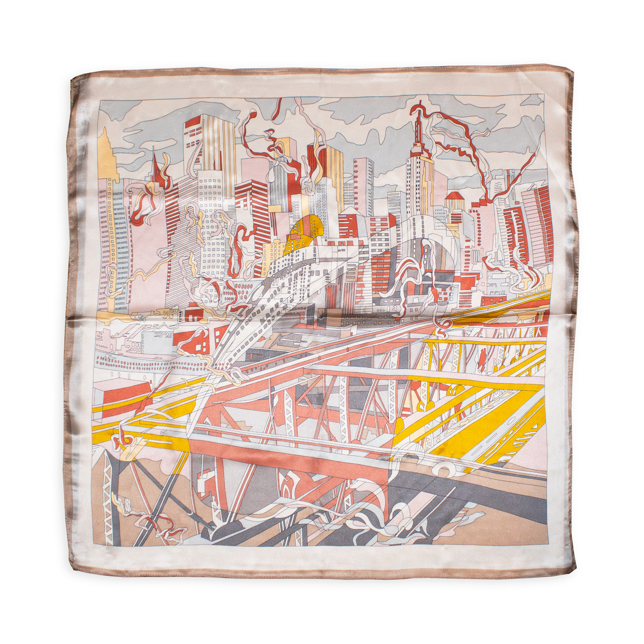 A silk scarf depicting a modern cityscape in warm tones of gold, rust, and grey. Dynamic lines and architectural forms evoke movement and energy—an artful blend of urban sophistication and Parisian creativity.