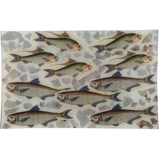 A shimmering school of antique fish prints glides beneath hand-blown glass, each image layered with artisan precision in New York City.