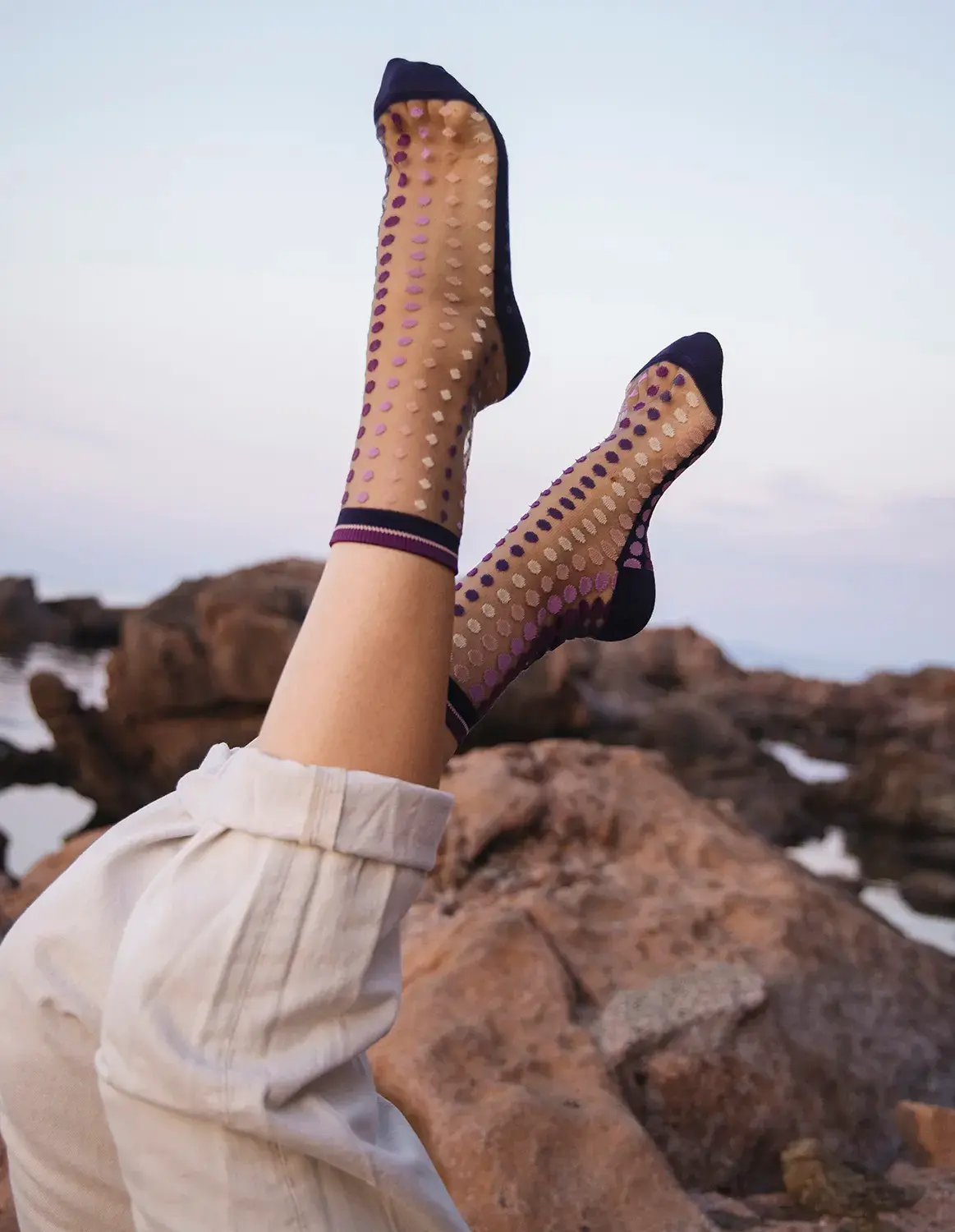 The Vetrata Violette sock features polka dots in shades of violette that delicately hug your ankle. Full of chic, it will go wonderfully with loafers and a skirt or black pants. US Size 7–8.5