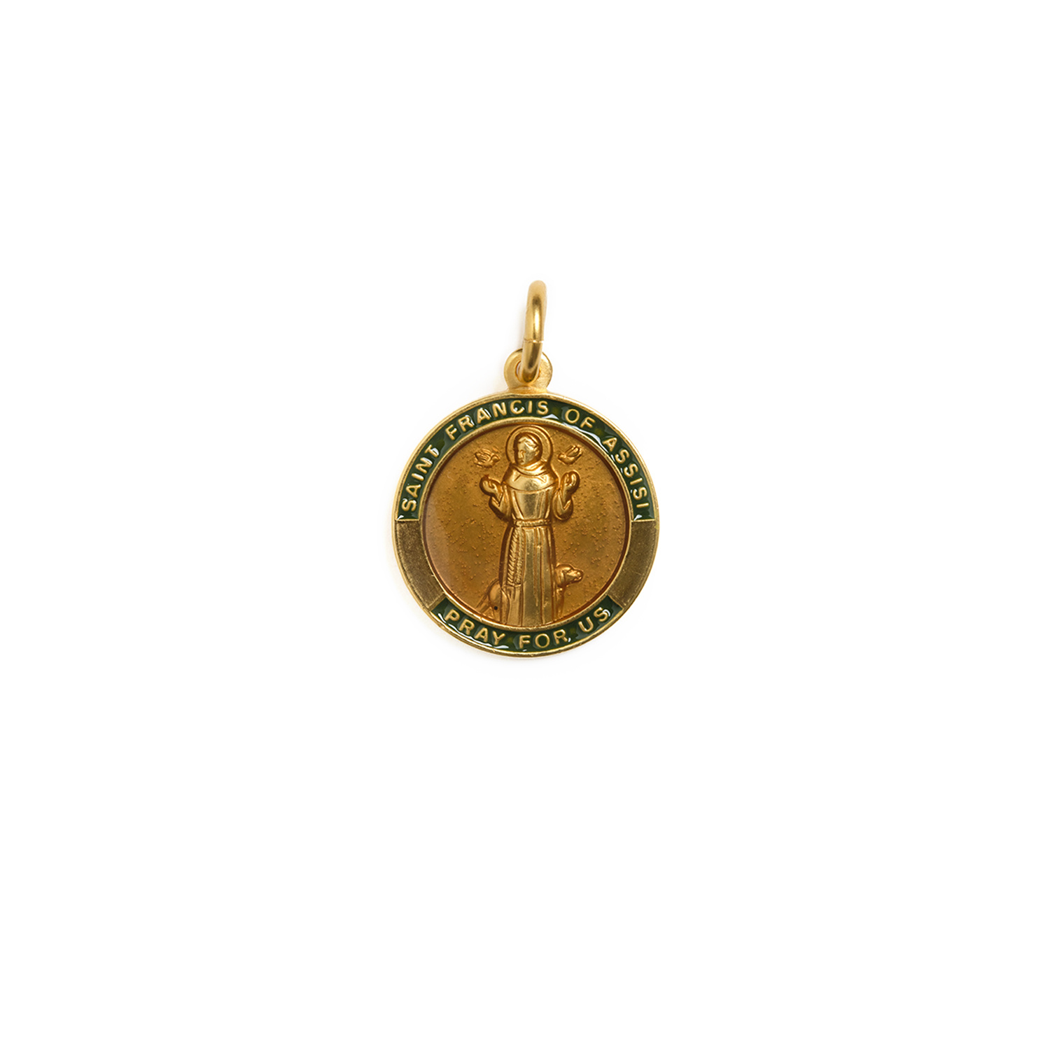 Drawn from an Italian devotional token, this charm shows Saint Francis in humble prayer, surrounded by small creatures at his hands and feet. As the patron saint of animals and peace, his presence conveys gentleness and stewardship.