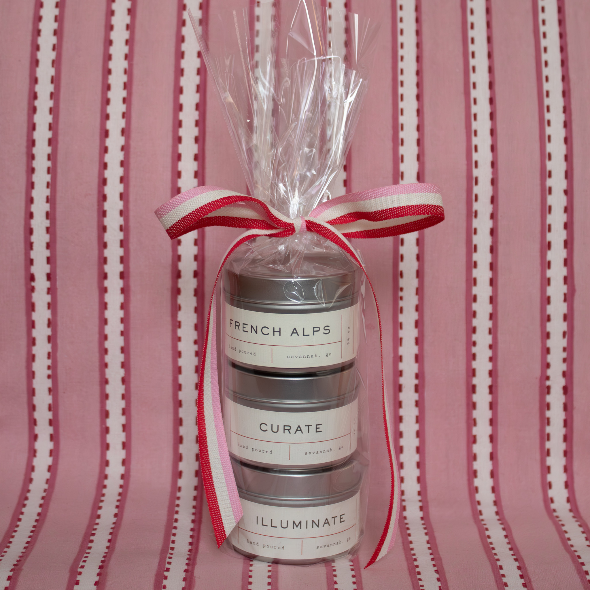 Three travel-size candle tins, Illuminate, Curate, and French Alps, designed to bring warmth and atmosphere wherever you land. A portable ritual inspired by discovery, thoughtful design, and the quiet romance of daily life.