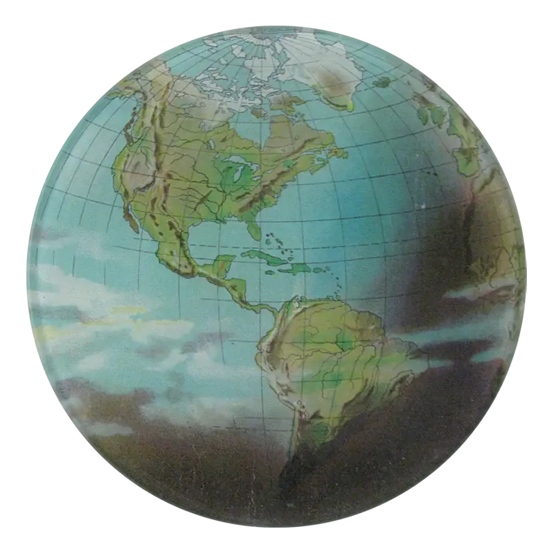 A vintage-printed world map in miniature, layered beneath hand-blown glass. Handmade to order in New York City, this 5¼″ round plate brings travel-inspired charm and timeless artistry to your shelf or wall.